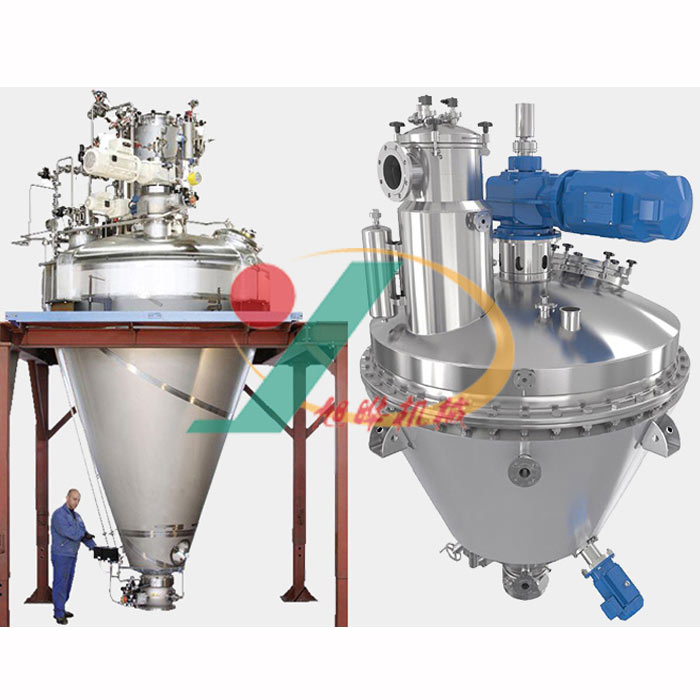 單錐真空干燥機(jī)由電機(jī)、減速機(jī)、機(jī)架、機(jī)械密封、金屬燒結(jié)網(wǎng)過濾器、空心雙螺帶攪拌器、帶夾套加熱的錐型筒體和卸料閥等部件組成。