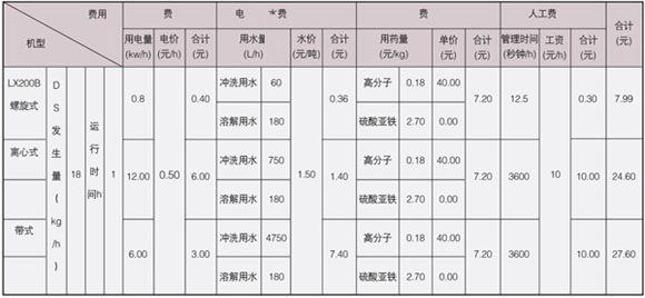 在處理量相同的前提下,螺旋式運(yùn)行成本為7.99元/h,離心式為24.6元/h,帶式為27.6元/h,相對而言,螺旋式運(yùn)行成本為離心式的1/3,是帶式的1/4左右,若以一天8小時(shí)工作時(shí)間,工作一個(gè)月計(jì)算著得出:
