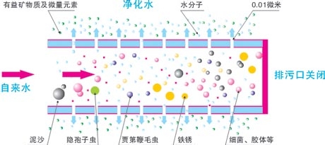 4、反滲透(RO):過(guò)濾精度在0.0001微米左右,是美國(guó)60年代初研制的一種超高精度的利用壓差的膜法分離技術(shù)。可濾除水中的幾乎一切雜質(zhì)(包括有害的有益的),只能允許水分子通過(guò)。一般用于飲用純凈水、工業(yè)超純水、醫(yī)藥超純水的制造。反滲透技術(shù)需要加壓、加電,水的利用率低。